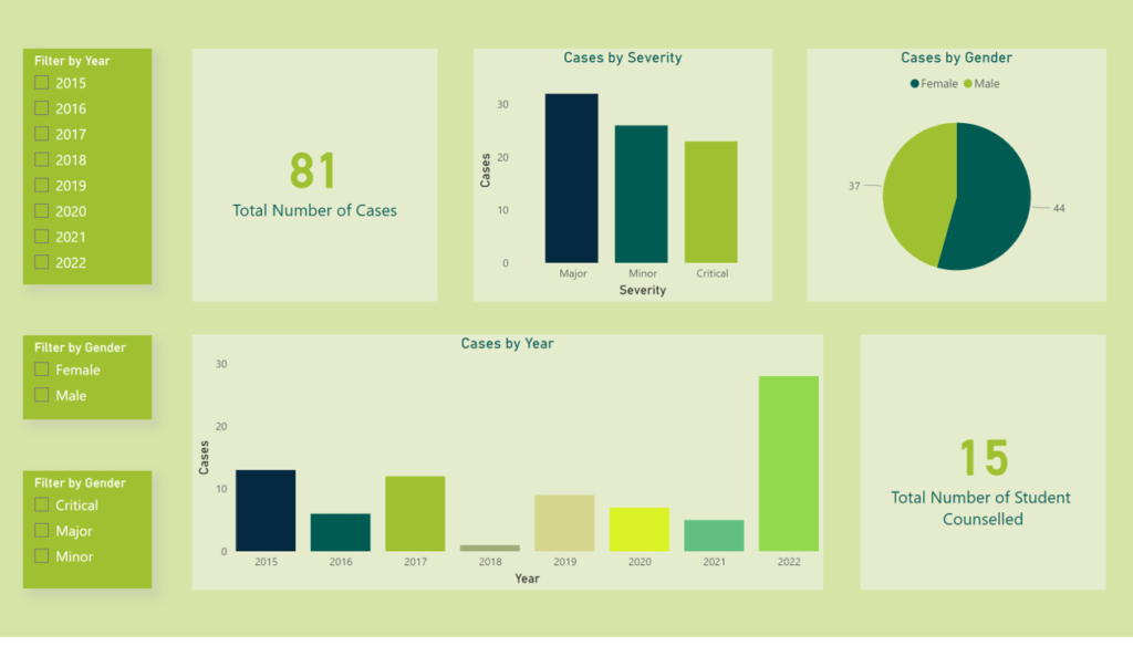 Filter and sort your reports so that you can focus on the data that matters most to your school. Export reports with statistics on new students, houses, years, counsellors, referral sources, and severity levels. Access lists of student appointments for each week, month, week, term and year.