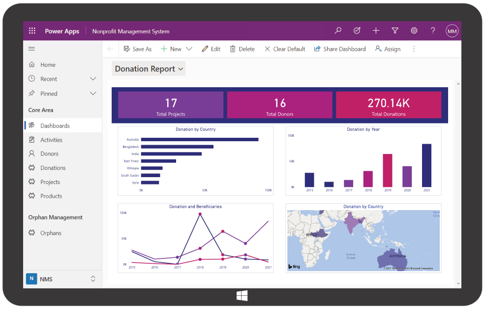 We build Dynamics 365 custom solutions with special needs of nonprofits on mind. We employ Dynamics 365, Power Apps, Microsoft Dataverse (Previously known as Common Data Model) to build these customized, cloud-based management solutions. We integrate Power BI with the solution to create reports for our customers which provide them with important insights to make data-driven decisions. With Power BI we create insightful and visually stunning reports for decision makers.